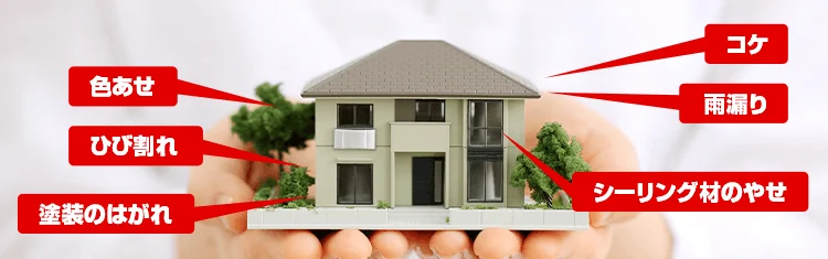 多くのお家の場合、上記の図のような現象が起きます。多いのはシーリングのやせ、コケや藻がついている、外壁塗装がひび割れしている、外壁塗装や屋根塗装が色あせしている、塗装がはがれているといった事でしょうか。